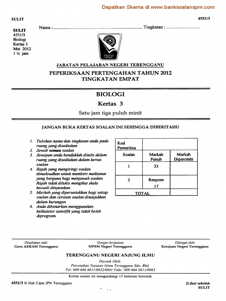Biologi Kertas 3 Ting 4 Pertengahan Tahun 2012 Terengganu Pdf